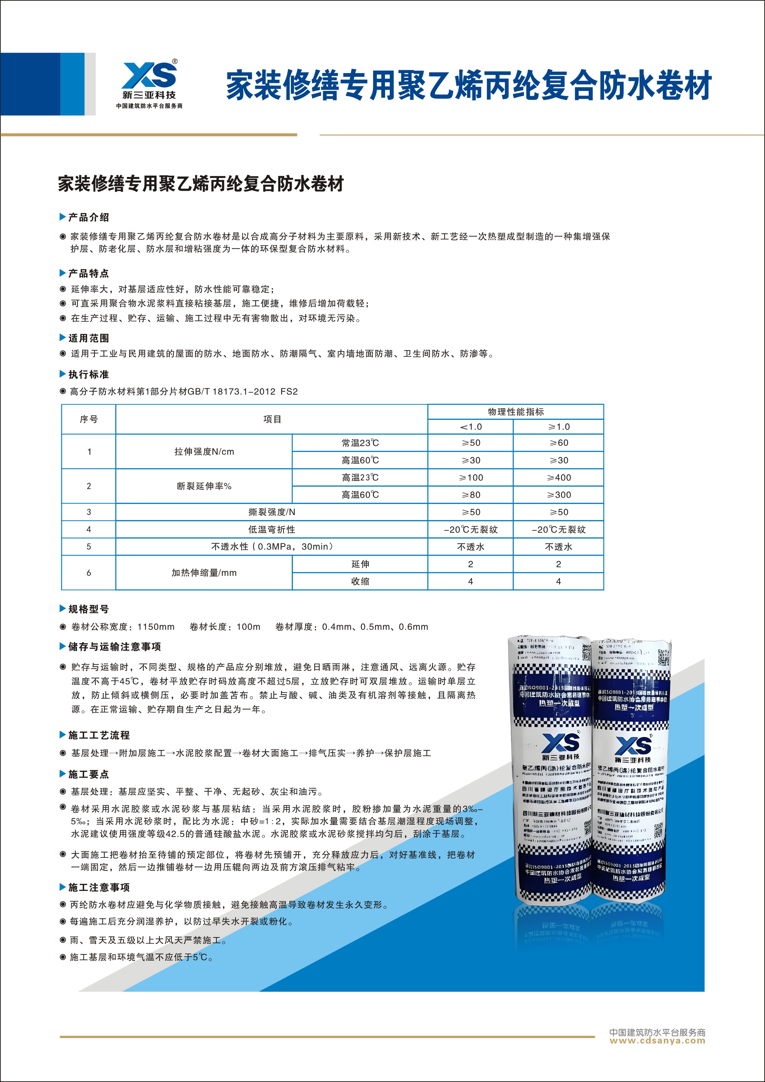 產(chǎn)品簡介: 乙烯丙綸復(fù)合防水卷材是以合成高分子材料為主要原料,采用新技術(shù)、新工藝經(jīng)一次熱塑成型制造的一種集增強(qiáng)保護(hù)層、防老化層、防水層和增粘強(qiáng)度為一體的環(huán)保型復(fù)合防水材料。 規(guī)格: FS2-PE-0.6mm 1.15m×100m | ![]() | ![]() |